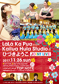 2017.11.26.SUN LāLā Ka Pua with Kailua Hula Studio & ひづきようこ ジョイントライブ 会 場:LIVE&PARTY SPACETOP NOTE 時 間:OPEN 12:00、START 13:00~End 16:00 料 金:[当日料金] 2,000円(高校生以上)[小中学生] 500円