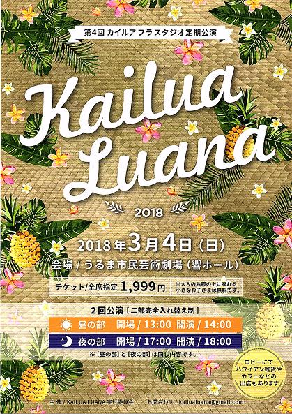 2018.3.4.SUN Kailua Luana 2018 会 場:うるま市民劇場(響きホール)二部入れ替え制 時 間:[昼の部] 開場13:00 開演14:00 [夜の部] 開場17:00 開演18:00 料 金:1,999円(全席指定)