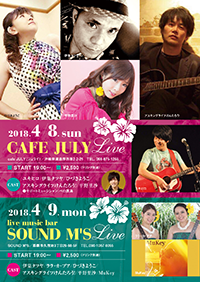 2018.4.9.SUN サウンドMSライブ LIVE 会 場:サウンドMSライブ 那覇市久茂地3丁目29-68-5F TEL.090-1067-8055 時 間:19:00 START 料 金:2,500円 (ドリンク別途) 出 演:伊集タツヤ/ララ・カ・プア/ひづきようこ/アスキングライフけんたろう!/平野里沙/MuKey
