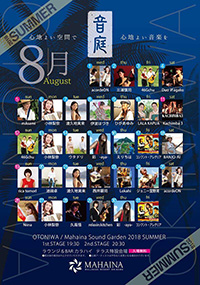 2018.8.10.FRI 音庭 Mahaina Sound Garden 2018 SUMMER 会 場:ホテルマハイナ ウエルネスリゾートオキナワ ラウンジ&BAR カラハイ テラス特設会場 時 間:1st 19:30~、2nd 20:30~ 料 金:入場無料