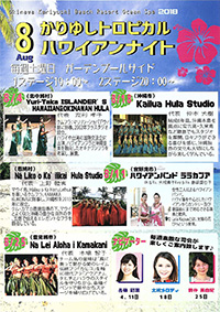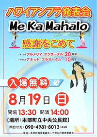 2018.8.19.SUN “ハワイアンフラ発表会 Me Ka Mahalo” 感謝をこめて プルメリア フラサークル(本部)20周年 アネット フラサークル(今帰仁)10周年 会 場:本部町立中央公民館(0980-47-5211) 〒905-0212 沖縄県国頭郡本部町大浜874番地1 時 間:開場 13:30~、開演 14:00~ 料 金:入場無料 お問い合わせ:090-4981-8013(島袋)