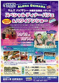 2018.10.13.SAT / 14.SUN サムズ バイザシー スペシャルディナーバフェ &ハワイアンショー ★ 13日・14日両日共にチケットは完売いたしました。 会 場:サムズバイザシー 沖縄泡瀬店 パティオ 時 間:開場 17:30~ 開演 19:00~ 料 金:大人¥4,980/小人(6才~12才)¥1,600/幼児(4才~5才)¥800 ※ 全て税別