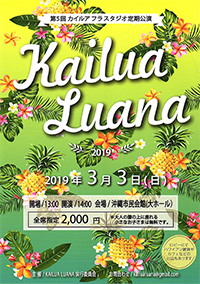 2019.3.3.SUN 第5回カイルアフラスタジオ定期公演 "Kailua Luana 2019" 会 場:沖縄市民会館(大ホール) 時 間:開場 13:00 開演 14:00 料 金:¥2,000(全席指定)