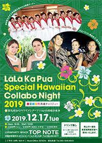 2019.12.17.TUE LāLā Ka Pua Special Hawaiian Collabo Night 2019 (首里城復興再建チャリティー) 会 場:Restaurant&Music Spot “Top Note”(那覇市久米2-8-10パーム久米ビルB1) 時 間:開場 18:00/開演 19:00 料 金:大人 2,500円/高校生・大学生 2,000円(小中学生無料) ※ドリンク無し、お一人様一品以上のご注文をお願い致します。 ※売上の一部を首里城再建支援へ寄付致します。