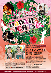2022年12月2日 ライブに寄せて(PDF)> 2022.12.2.FRI LāLā Ka Pua 10th+1ANNIVERSARY Thank you Come back HAWAIIAN NIGHT at Top Note ※SOLDOUT 会 場:Restaurant & Music spot TopNote 那覇市久米2-8-10パーム久米ビルB1 電話:098-869-9077 時 間:開場 18:00 開演 19:00 ●Opening performance 19:00-19:20 ●1st 19:30-20:10 ●2nd 20:40-21:20 料 金:前売 2,000円、当日 2,500円(小学生以下1,000円) ※ドリンクなし、ご来場時にお一人様1品以上ご注文のご協力をよろしくお願いいたします。 お問合せ:Restaurant & Music Spot “Top Note” 〒900-0003 那覇市久米2-8-10パーム久米ビル Tel.098-869-9077)
